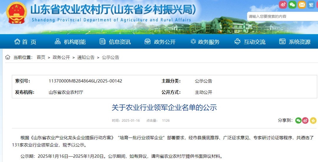 1月17日,记者通过山东省农业农村厅(山东省乡村振兴局)官网获悉:根据《山东省农业产业化龙头企业提振行动方案》“培育一批行业领军企业”部署要求,经市县摸底推荐、广泛征求意见、专家研讨论证等程序,共遴选了131家农业行业领军企业,现予以公示。